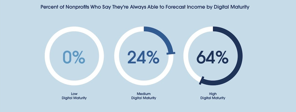 In this year’s report, digital maturity continues to matter: 64% of nonprofits in the “high digital maturity” category said they were able to forecast income accurately, compared to 0% in the “low digital maturity” category.