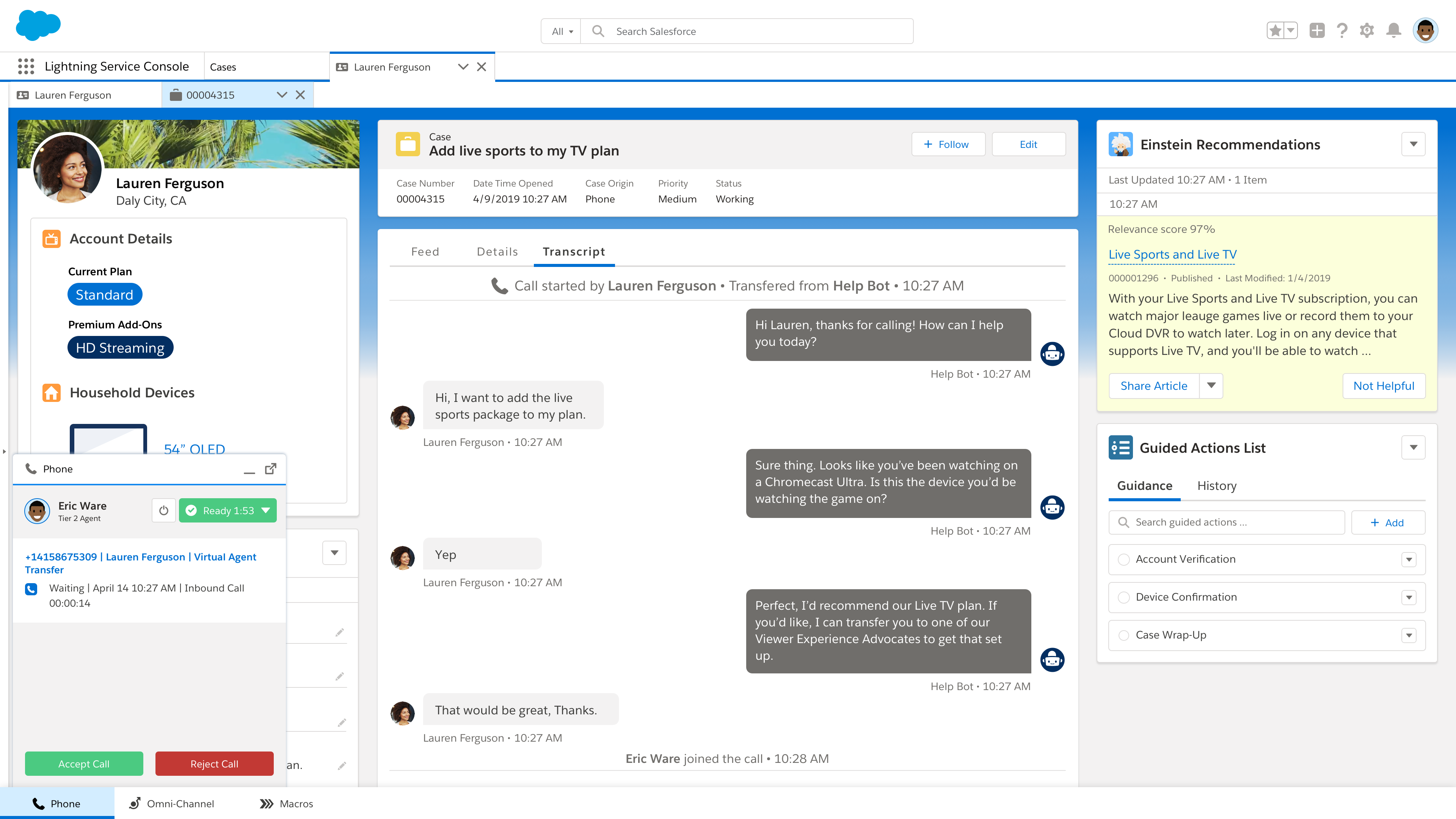 When calls are passed to a human agent, the Salesforce Service Cloud console gives them all the information they need to expedite case resolution — including the full call transcript.