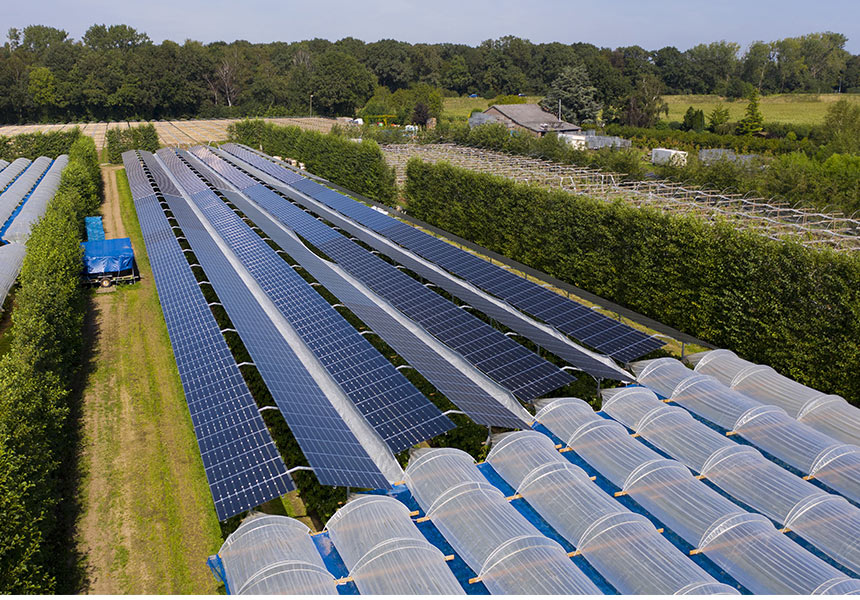 Himbeerpflanzen beispielsweise ist in vielen Gebieten die Sonneneinstrahlung im Sommer zu hoch, im Winter dagegen müssen sie mit Planen geschützt werden. BayWa r.e. hat hierfür spezielle Anlagen entwickelt, die so hoch über den Pflanzen angebracht werden, dass landwirtschaftliche Fahrzeuge unter ihnen hindurch fahren können. Um das richtige Maß an Licht- und Luftdurchlässigkeit zu gewährleisten, werden speziell gefertigte Module mit weniger Solarzellen genutzt. Gleichzeitig sind an der Befestigung Leitungen für die Bewässerungsanlage angebracht.