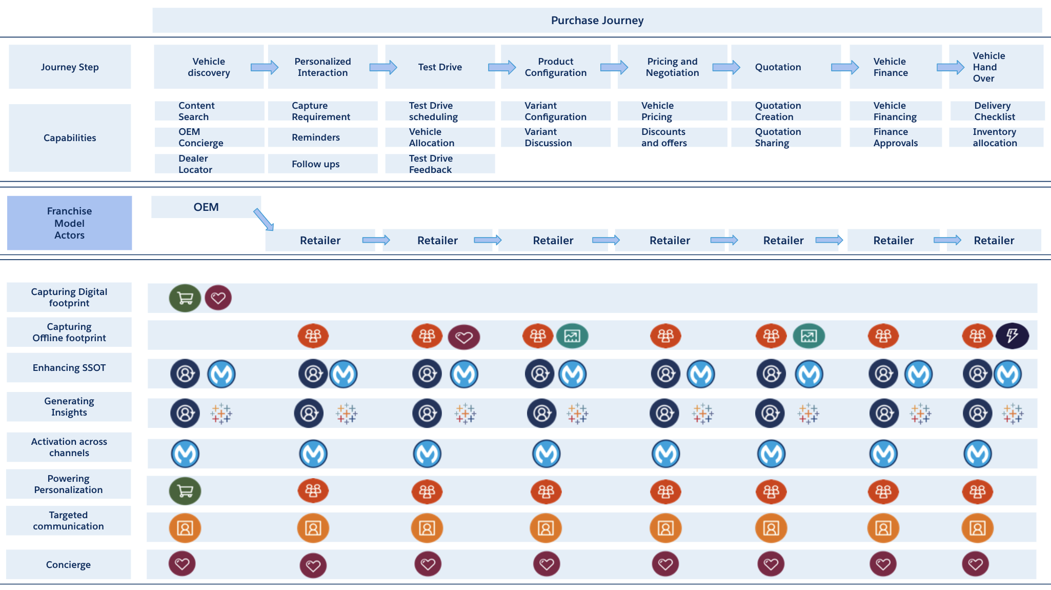 Following is a representative mapping of how Salesforce Customer 360 powers the purchase journey in the Franchise model.