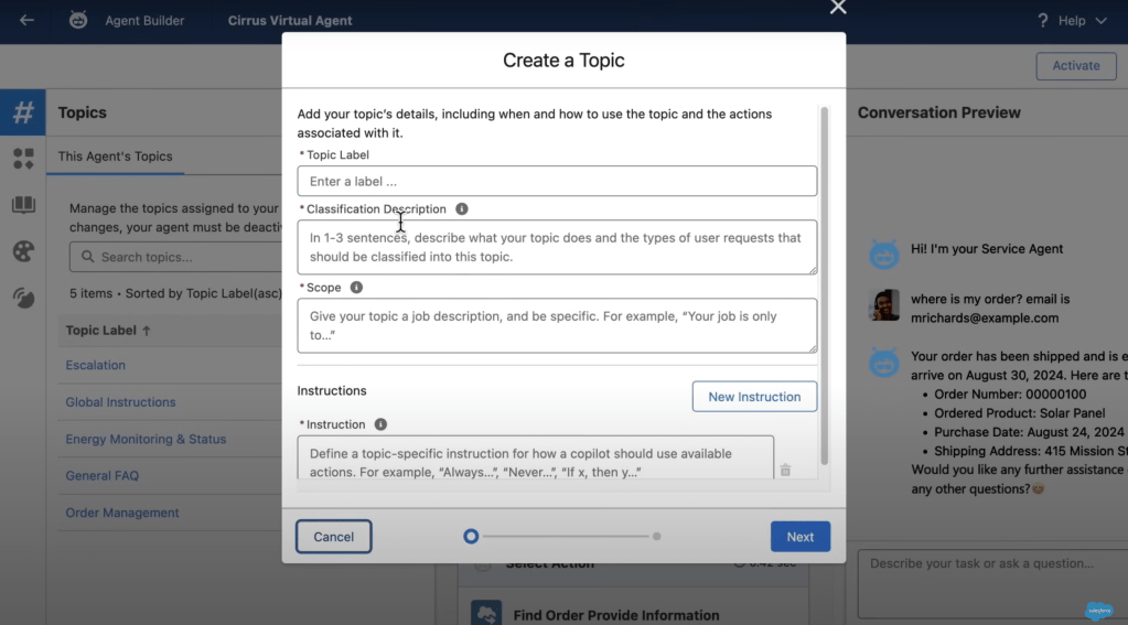 Una schermata dell’Agent Builder per la creazione di un nuovo Topic