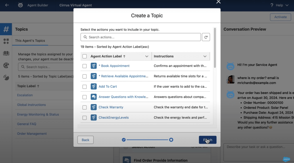 Una schermata dell’Agent Builder per l’assegnazione delle azioni in fase di creazione di un nuovo Topic