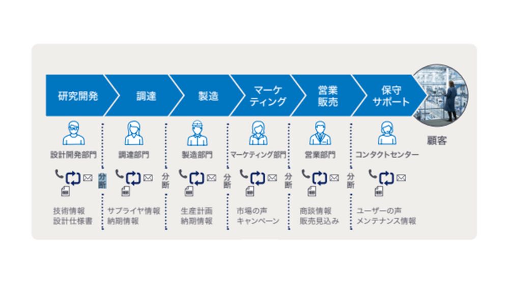 これまでの製造業におけるバリューチェーンは、事業活動ごとに個別最適化を図っているケースが多く、分断されてしまっていました。