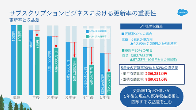 この企業の現在の収益は年間10億円ですが、更新率が90%の場合と80%の場合では、時間が経つほどに収益の差が広がっていきます。そして5年後には、収益差の累積額は9億9,631万円、つまり現在の1年分の収益に匹敵するほどの額に上ります。