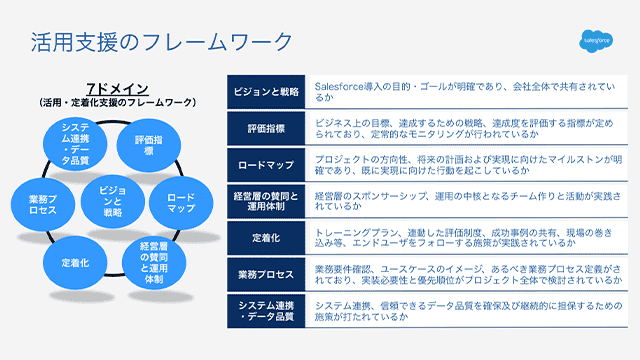 当社の場合、自社サービスの活用・定着化支援に活用するチェック項目を、フレームワークとしてまとめています。サンプルを応用することで、無理なく漏れを防ぎ、カスタマーサクセスの活動拡大を図れるでしょう。