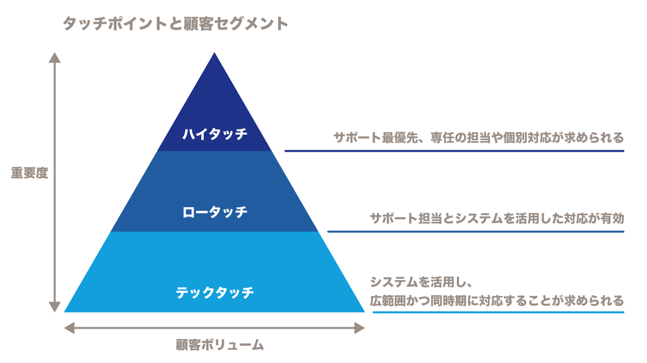 タッチモデルは、顧客に対するアプローチ方法を区分するための枠組みであり、以下のように3つの区分があります。