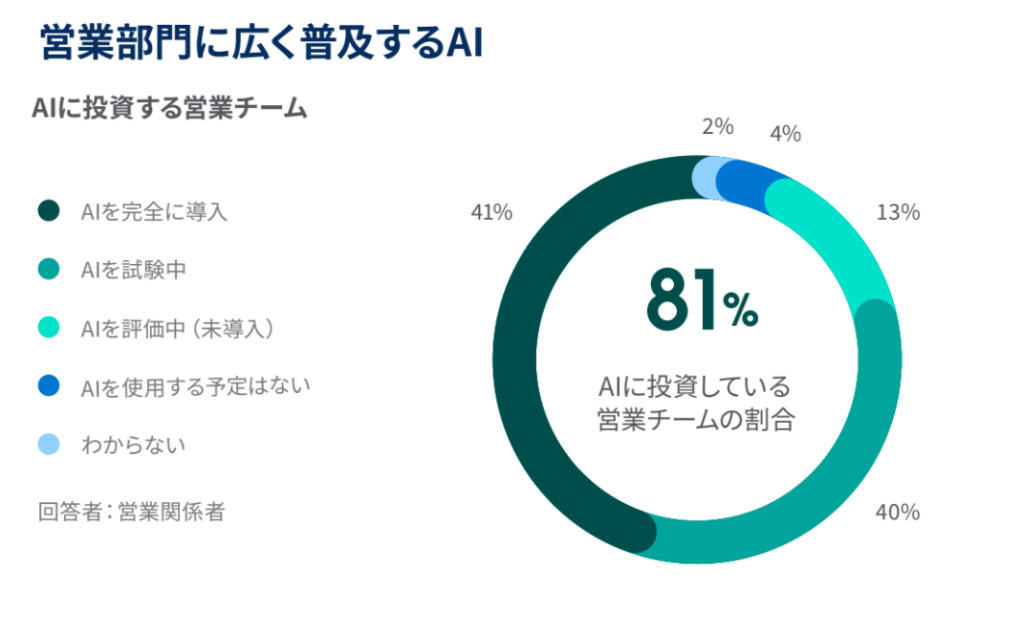 - 日本の営業部門の42%がAIを完全に導入しているか、試験運用中です。さらに営業部門の24%では、AIの導入を検討している段階です。