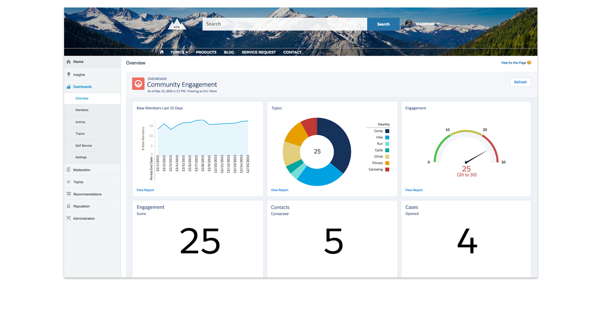 The new Lightning dashboard in the community management console helps you understand how customers use the community. Measure adoption and engagement, most popular groups, users, and topics.