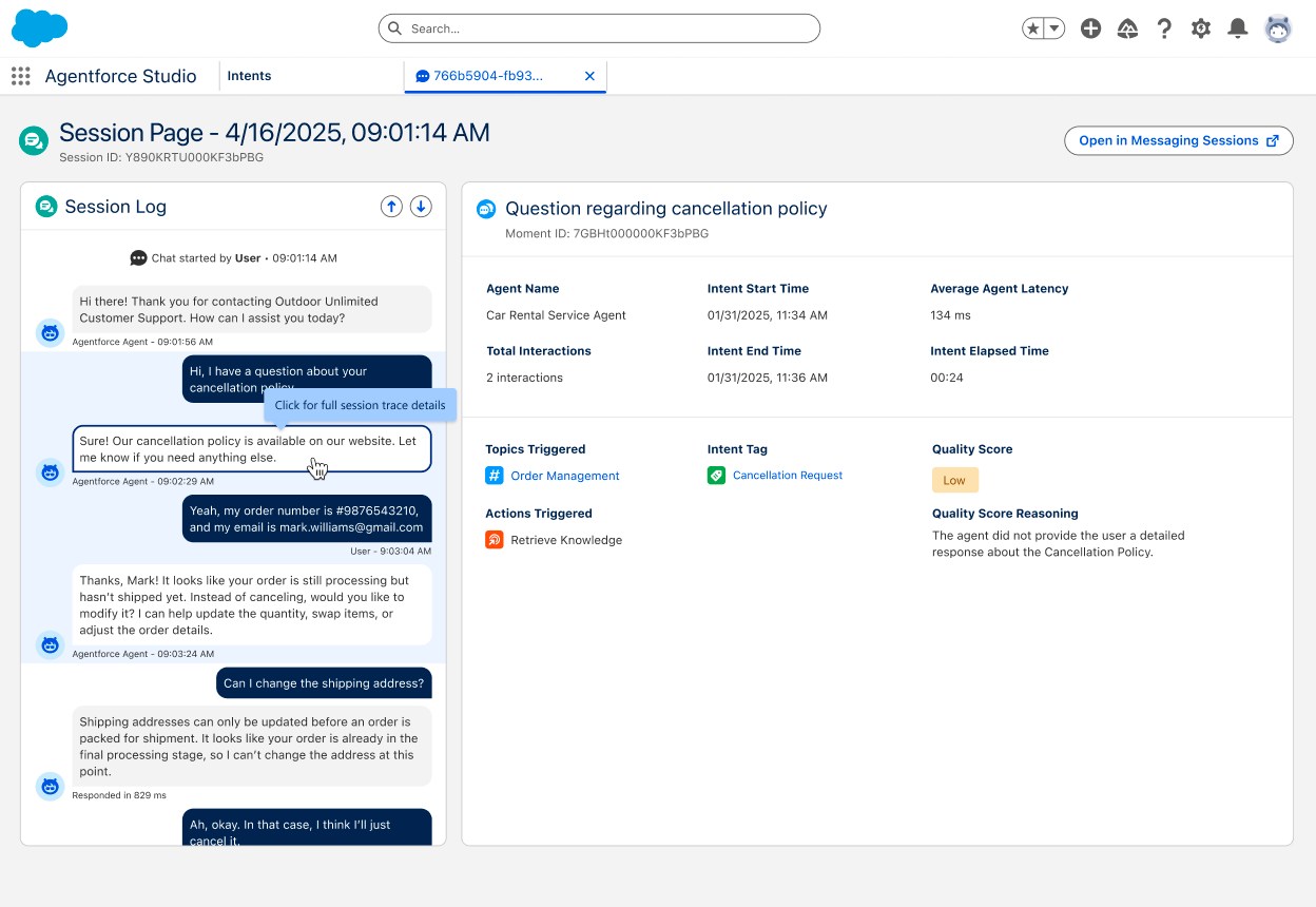 After thousands of Agentforce implementations — from Goodyear to Finnair — it’s clear that customers need better visibility, more granular metrics, and actionable recommendations to improve the accuracy, quality, cost, and latency of their agents. To equip our customers with the tools to tackle this challenge, we’re introducing deep observability within Agentforce Studio.