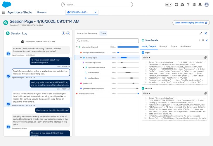 Agentforce Observability not only helps surface shortfalls and highlight areas for improvement, but it also gives you complete diagnostic power. Our new Session Trace Data Model logs every interaction, including user inputs, agent responses, reasoning steps, LLM calls, and guardrail checks. This foundation is stored securely in Data 360, providing unified visibility and granular, session-level insights so you can ensure agents behave as intended and respond appropriately.