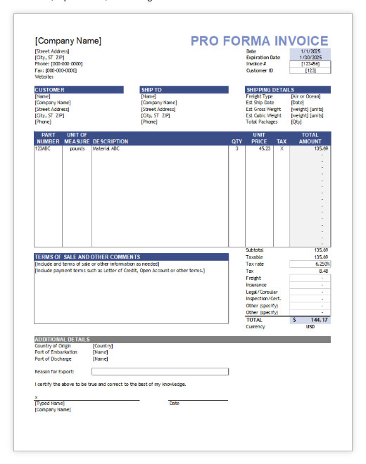 A quote is usually generated during the very early stages of a transaction (often during an initial inquiry or after a first sales call). It offers an estimate of the costs of what’s been discussed to give the buyer an idea of what they’ll be paying. A proforma invoice is generally issued after the buyer has agreed to purchase. It is more definitive and largely outlines the final terms of the sale.