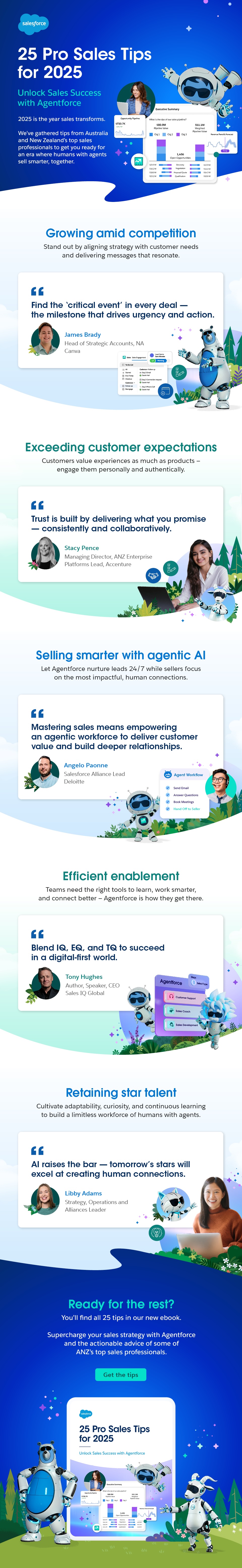 Download 25 Pro Sales Tips for 2025 and learn the secrets to sales success with Agentforce. Gain exclusive insights from ANZ’s top sales leaders to help you stand out, boost productivity, and build lasting customer relationships — all powered by trusted agentic AI.