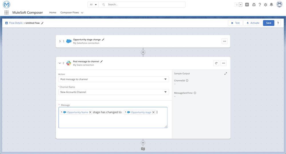 MuleSoft Composer for Salesforce makes it easy for business teams to compose a true 360-degree view of the customer and deliver connected experiences faster by automating integrations to common systems directly in Salesforce. With a library of pre-built connectors, including NetSuite, Salesforce, Workday, Slack, Google Sheets and Tableau, business teams can now securely integrate apps and data, and build automations to: