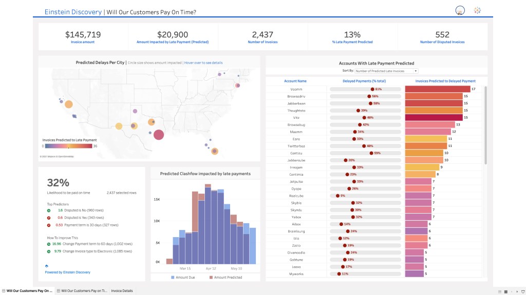 • AI-powered predictions, insights and automated explanations with Tableau Business Science lets sales teams analyze data and make smart decisions, faster, without relying on a data scientist — for example, when updating quotas, looking at forecast accuracy or reassessing selling strategies — all using clicks, not code.
