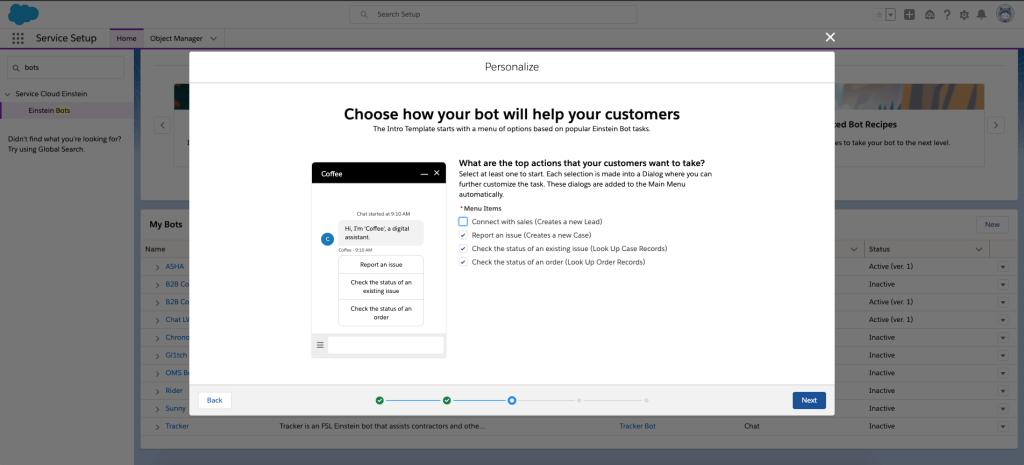 Einstein Bots are intelligent chatbots that simulate human conversations and can quickly resolve common issues like processing a return or checking a flight status. In doing so, they empower agents to devote more time and resources to complex problem-solving and customer interactions. In just a few clicks with Salesforce’s low-code capabilities, customers can deploy a new chatbot by leveraging Pre-Built Einstein Bots to assist with service requests.