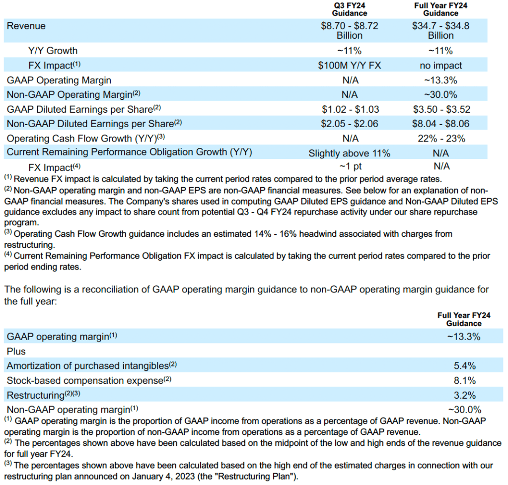 As of August 30, 2023, the Company is initiating its third quarter GAAP and non-GAAP diluted EPS guidance, current remaining performance obligation growth guidance, and revenue guidance. The Company is raising its full year FY24 revenue guidance, GAAP and non-GAAP diluted EPS guidance, GAAP and non-GAAP operating margin guidance, and operating cash flow growth guidance.