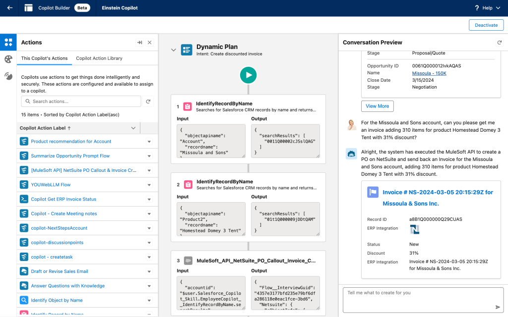 • Copilot Builder: Create AI actions to accomplish business tasks (beta) — Copilot Builder helps every company configure and customize Einstein Copilot for their business. Salesforce admins and developers can use tools they already have, like Apex, Flow, and MuleSoft APIs, and new generative AI components like prompts, to enable Einstein Copilot to complete tasks in the flow of work. Einstein Copilot can leverage these custom actions to complete tasks across any Salesforce application or external system.