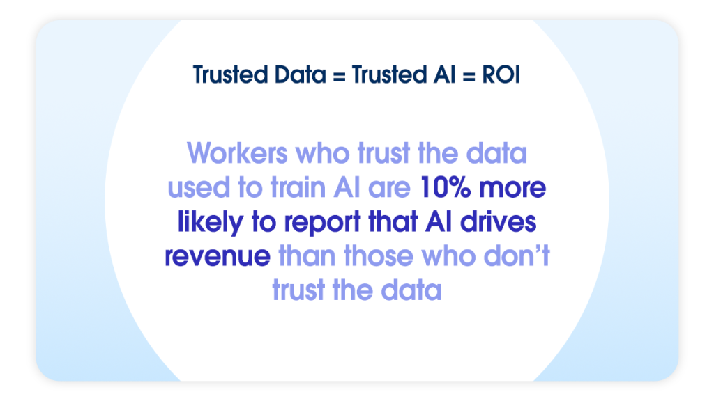 - Workers who trust the data used to train AI are 10% more likely to report that AI drives revenue than those who don’t trust the data.