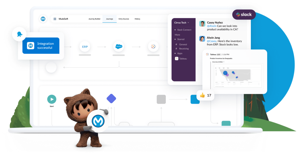 • Slack-First Integration with MuleSoft integrates multiple business apps directly into Slack, eliminating the need for context-switching between different software and systems.