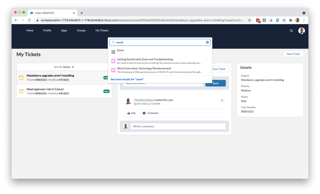 Employee Concierge: With Employee Concierge, employees can access a knowledge base and ticketing system directly from their Employee Workspace Experience Cloud site.