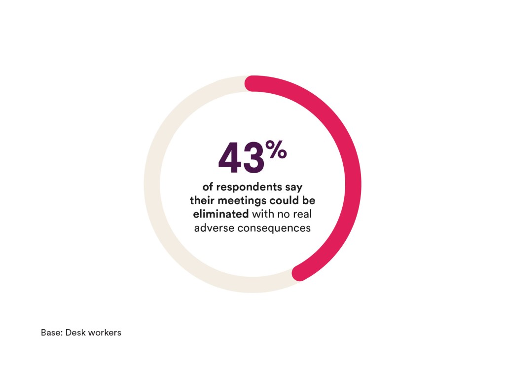 • Only 19% are encouraging asynchronous work, for example when sharing status updates. More than a third (35%) of employees cite spending too much time in meetings as a top productivity challenge. In fact, employees say that 43% of their meetings could be eliminated with no real adverse consequences.