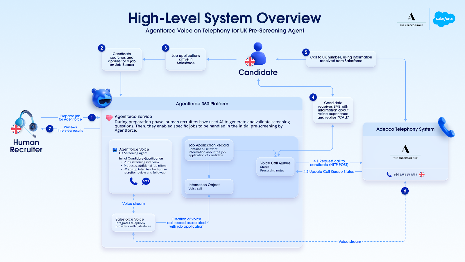 When applicants select voice, Salesforce pings Adecco’s telephony system, which initiates an outbound call from a UK number. When the candidate answers, the telephony system starts a conference call with a pre-defined Salesforce phone number, seamlessly connecting the applicant to the agent.