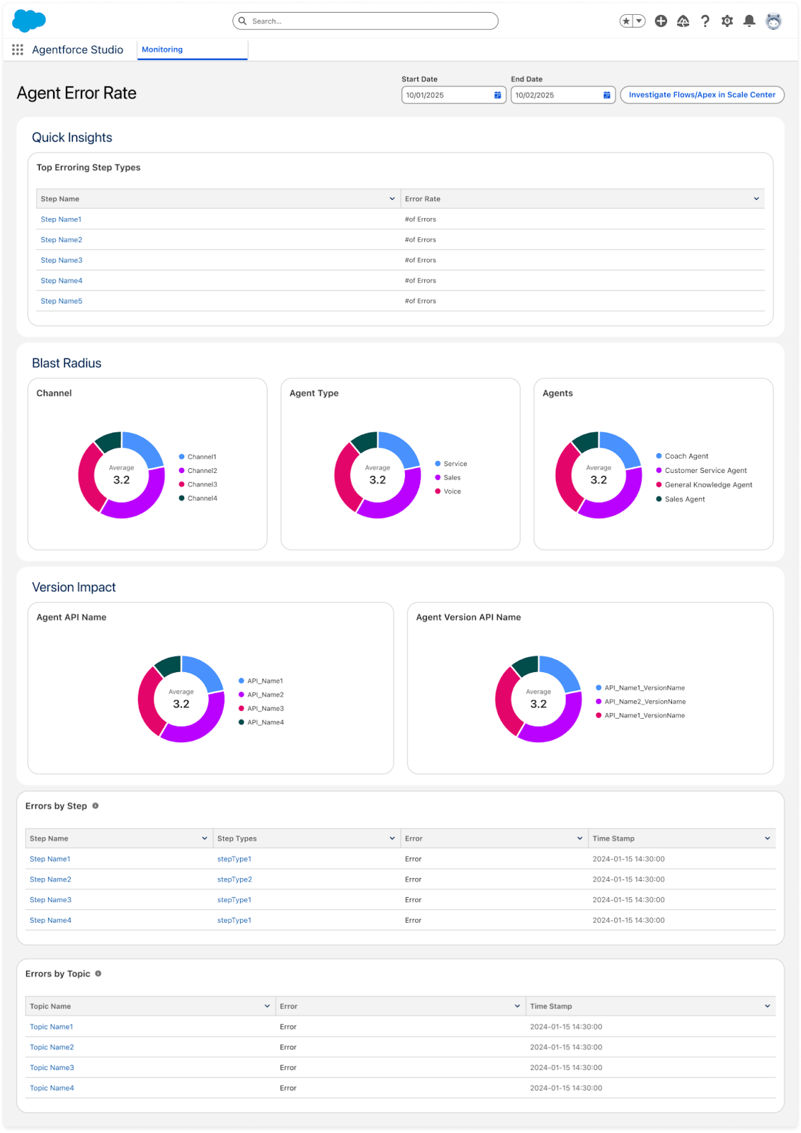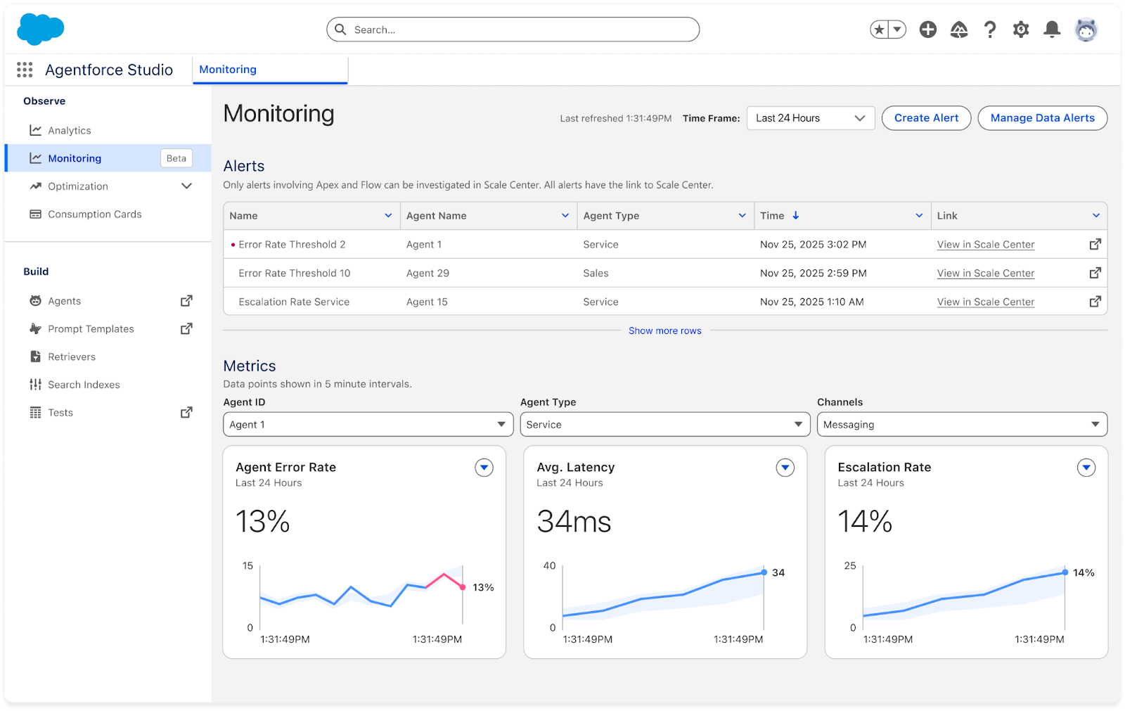 That’s why today, we’re excited to announce the beta launch of Agent Health Monitoring as part of Agentforce Studio’s Observability suite. This new solution provides the monitoring layer you need to track, and alert on your agents in production.