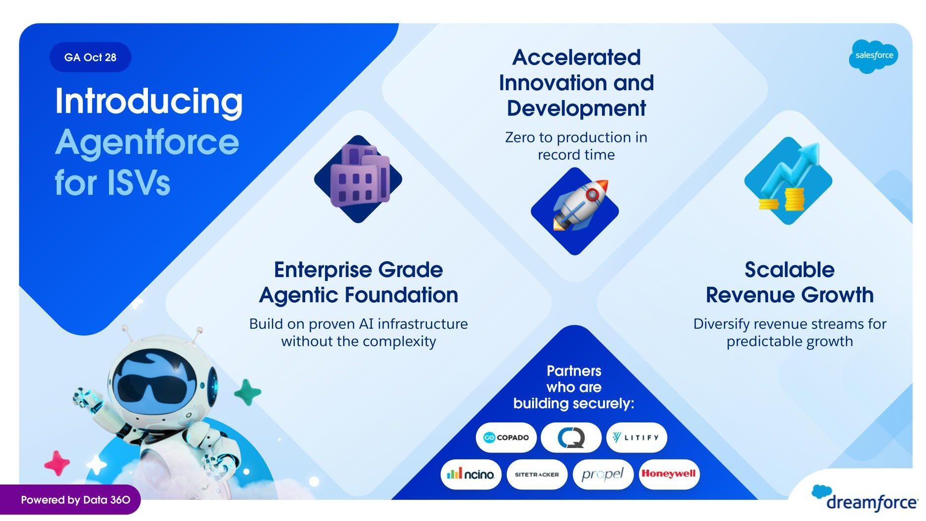 For the first time, Salesforce ISVs can build, package, and monetize their own full-stack agentic solutions with Agentforce and Data 360 with a consumption-based commercial model. These two products are fundamentally interlinked to power your new solutions: Data 360 provides the intelligent foundation for customer data, while Agentforce delivers the AI layer for proactive, automated engagement. This powerful combination gives you the transformative ability to architect and sell an integrated AI-native business, delivering instant access to enterprise credibility, a consumption-based revenue engine, and accelerated time to market. Phased access to Slack, Tableau, and Marketing Cloud will follow later this year.