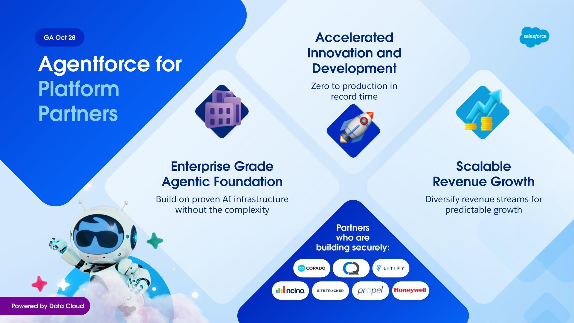 For the first time, Salesforce Platform Partners can build, package, and monetize their own full-stack agentic solutions with Agentforce and Data 360 with a consumption-based commercial model. These two products are fundamentally interlinked to power your new solutions: Data 360 provides the intelligent foundation for customer data, while Agentforce delivers the AI layer for proactive, automated engagement. This powerful combination gives you the transformative ability to architect and sell an integrated AI-native business, delivering instant access to enterprise credibility, a consumption-based revenue engine, and accelerated time to market. Phased access to Slack, Tableau, and Marketing Cloud will follow later this year.