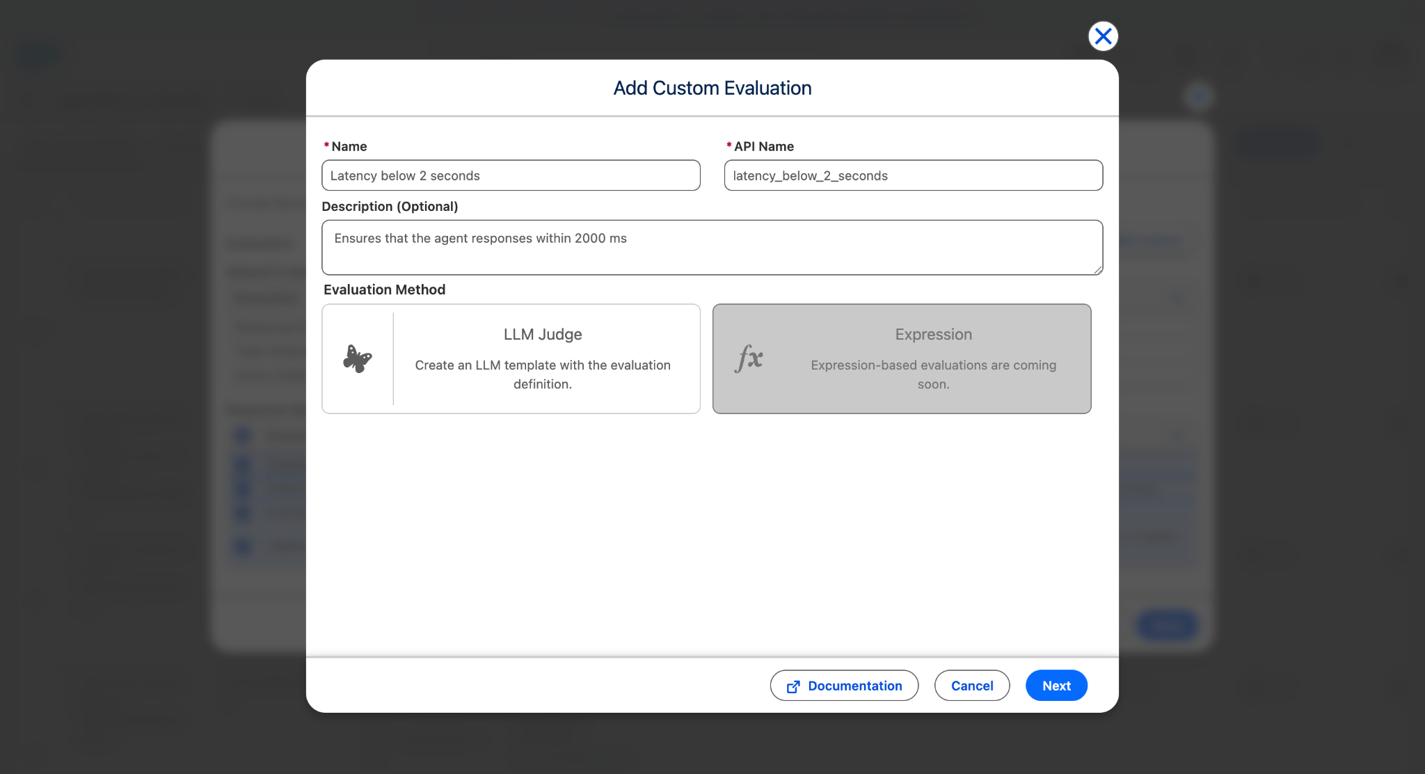 No one can define “good” better than the people building the agent and custom evaluations give you the ability to define your own scoring criteria. Within the test suite wizard, you’ll see an option to add a custom scorer. Define your evaluation criteria using natural language — for example, “Rate the politeness of the agent response on a scale of 0 to 5” — with descriptions of what each score level means and example responses. You can also set a pass/fail threshold. Once saved, your custom metric appears as a new column in the testing grid, right alongside the built-in evaluations.
