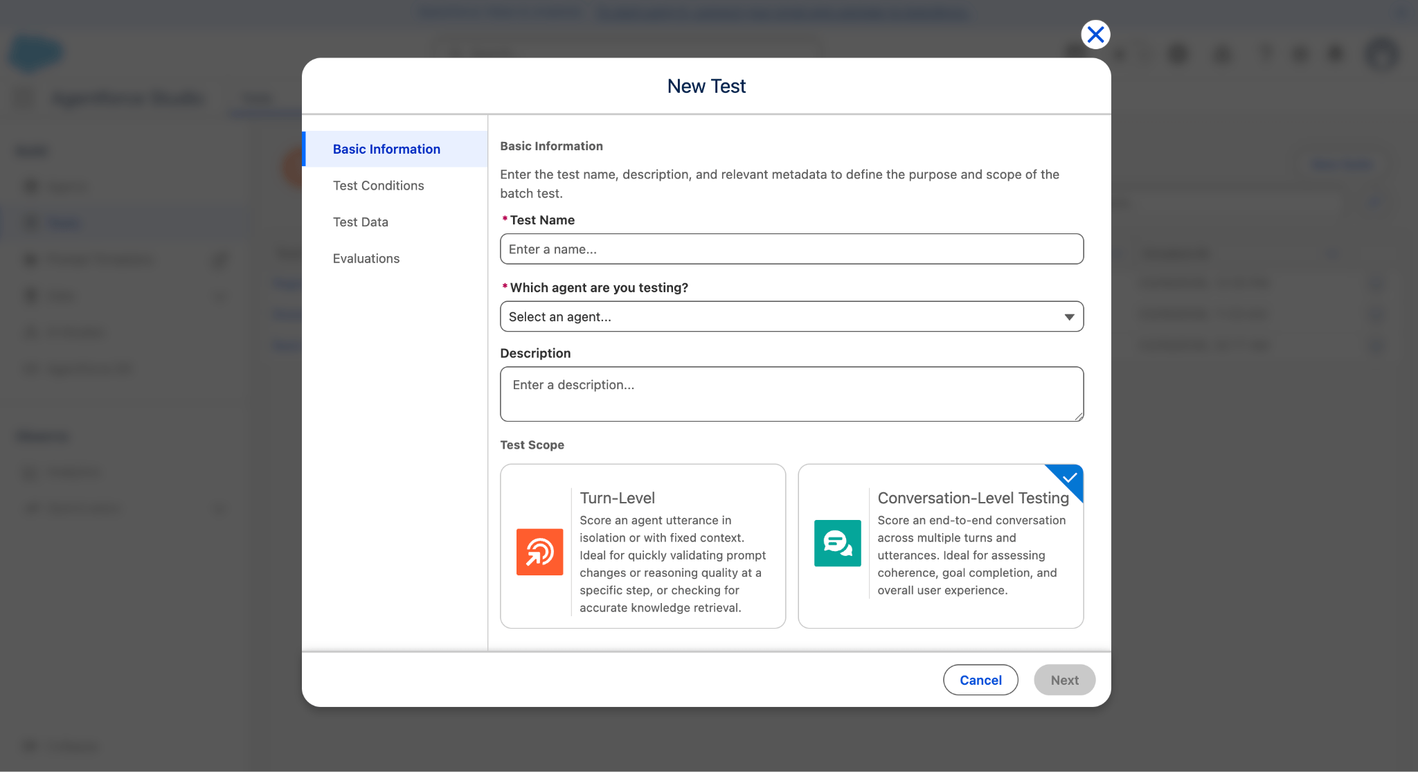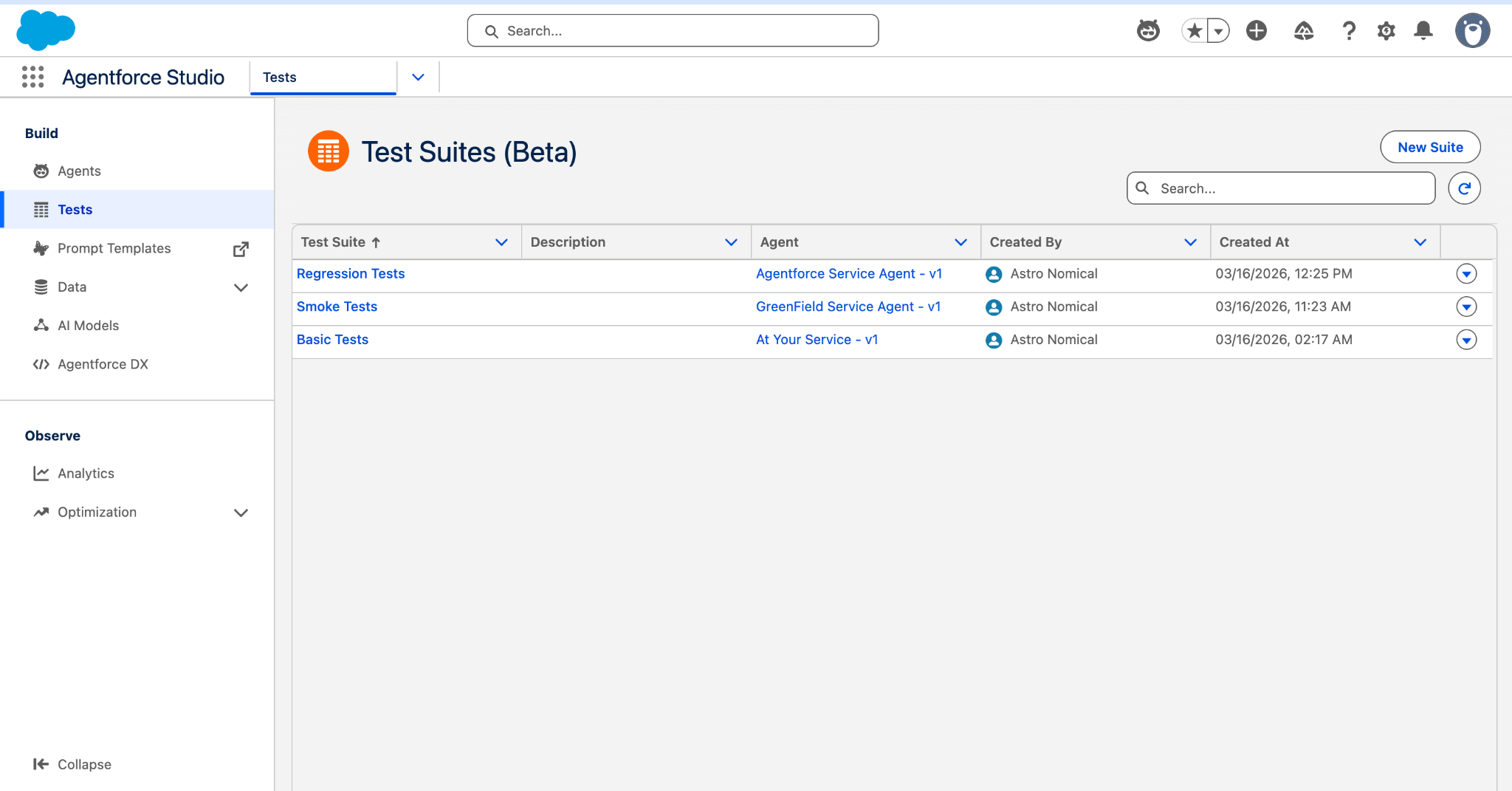 Testing Center used to live in Setup, disconnected from the tools you actually use to build your agent. To bring testing closer to the forefront, we’ve integrated it directly into Agentforce Studio as a dedicated tab alongside Agent Builder and Observability. Once you’ve built your agent (whether through the legacy builder or new agent builder), you can begin testing it immediately without having to navigate to another surface.