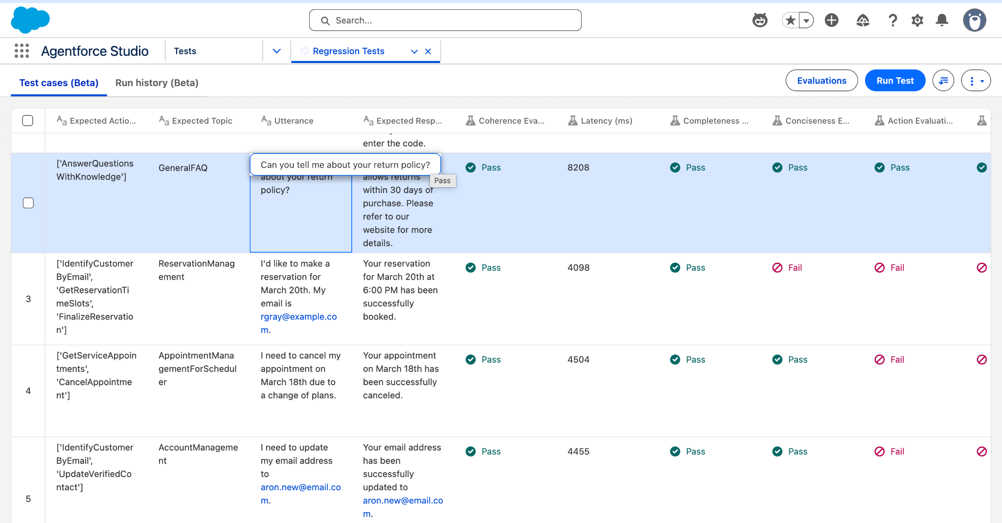 Agentforce Studio offers a more flexible user interface, as well as more powerful debugging capabilities. We’ve also added the ability to view run history, making it easy to evaluate agent performance over time by comparing historical test results.