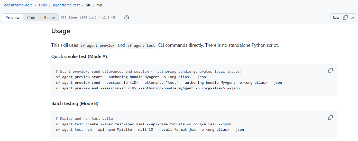 Salesforce’s ADLC (Agent Development Lifecycle) Skills are a set of CLI-based capabilities designed to support the full agent development lifecycle from the command line. Using the Salesforce CLI, developers can trigger test runs with sf agent run test, check on results with sf agent get test status, and retrieve outputs directly, all without opening a browser. This same experience extends to AI-powered IDEs like Cursor or Claude Code.