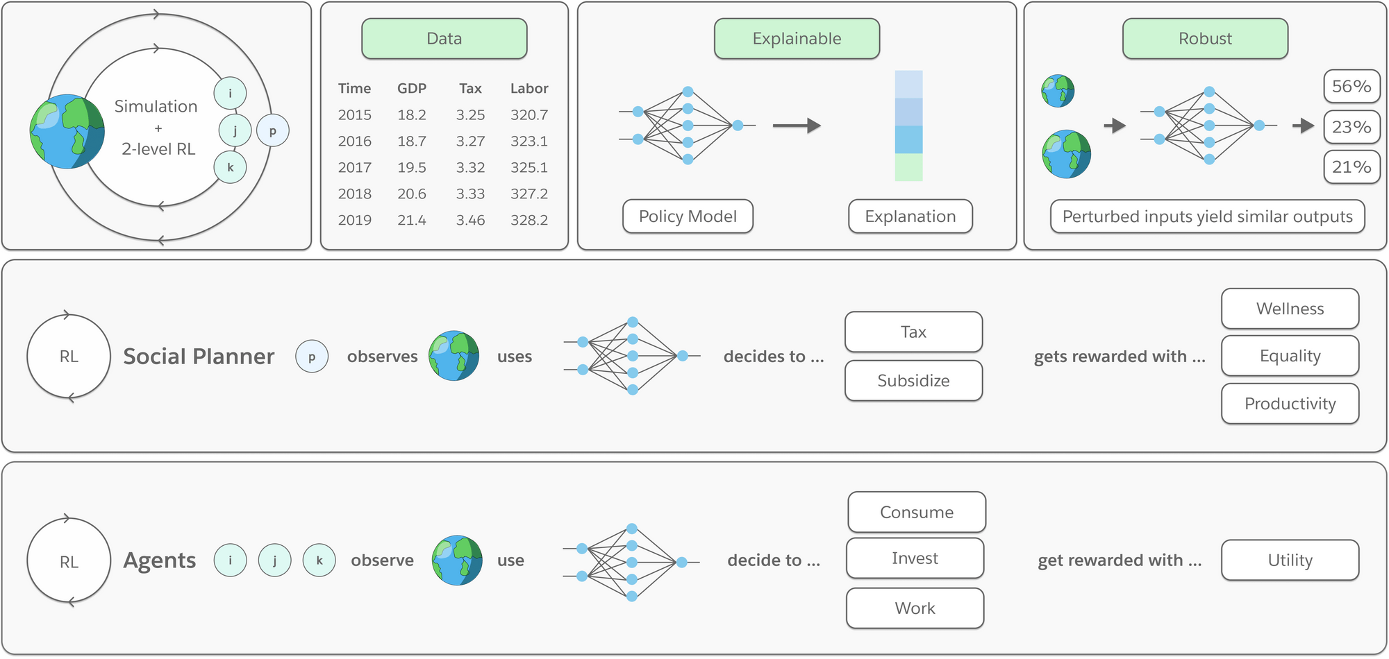 At Salesforce Research, we believe that business is the greatest platform for change. We developed the AI Economist framework to apply AI to economic policy design and use AI to improve social good.