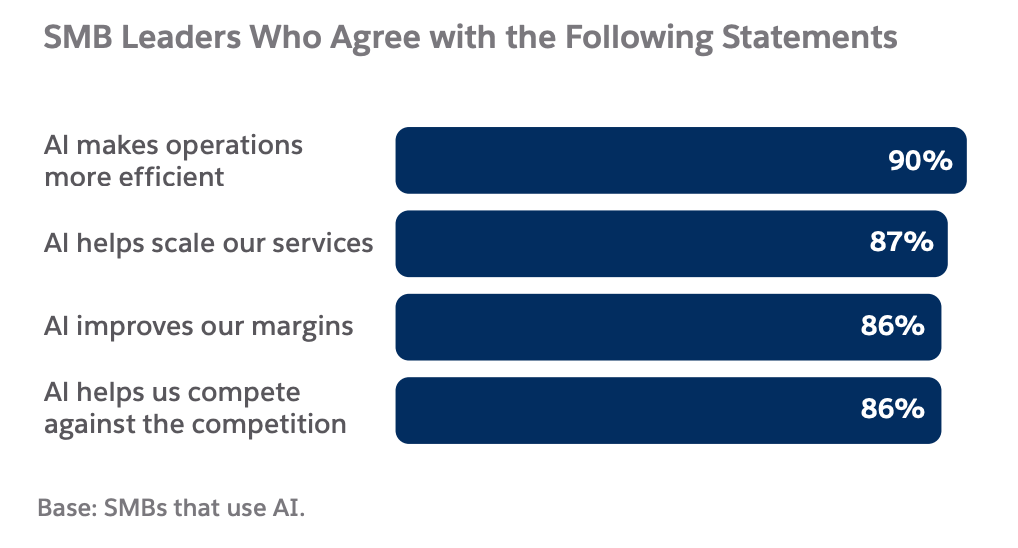 According to Salesforce’s latest Small and Medium Business Trends Report, 78% of SMB leaders say that AI will transform their business operations. For an SMB, every hour and dollar counts — and that’s why a thoughtful AI strategy becomes your competitive advantage. When your AI strategy works, it leads to results like the following: