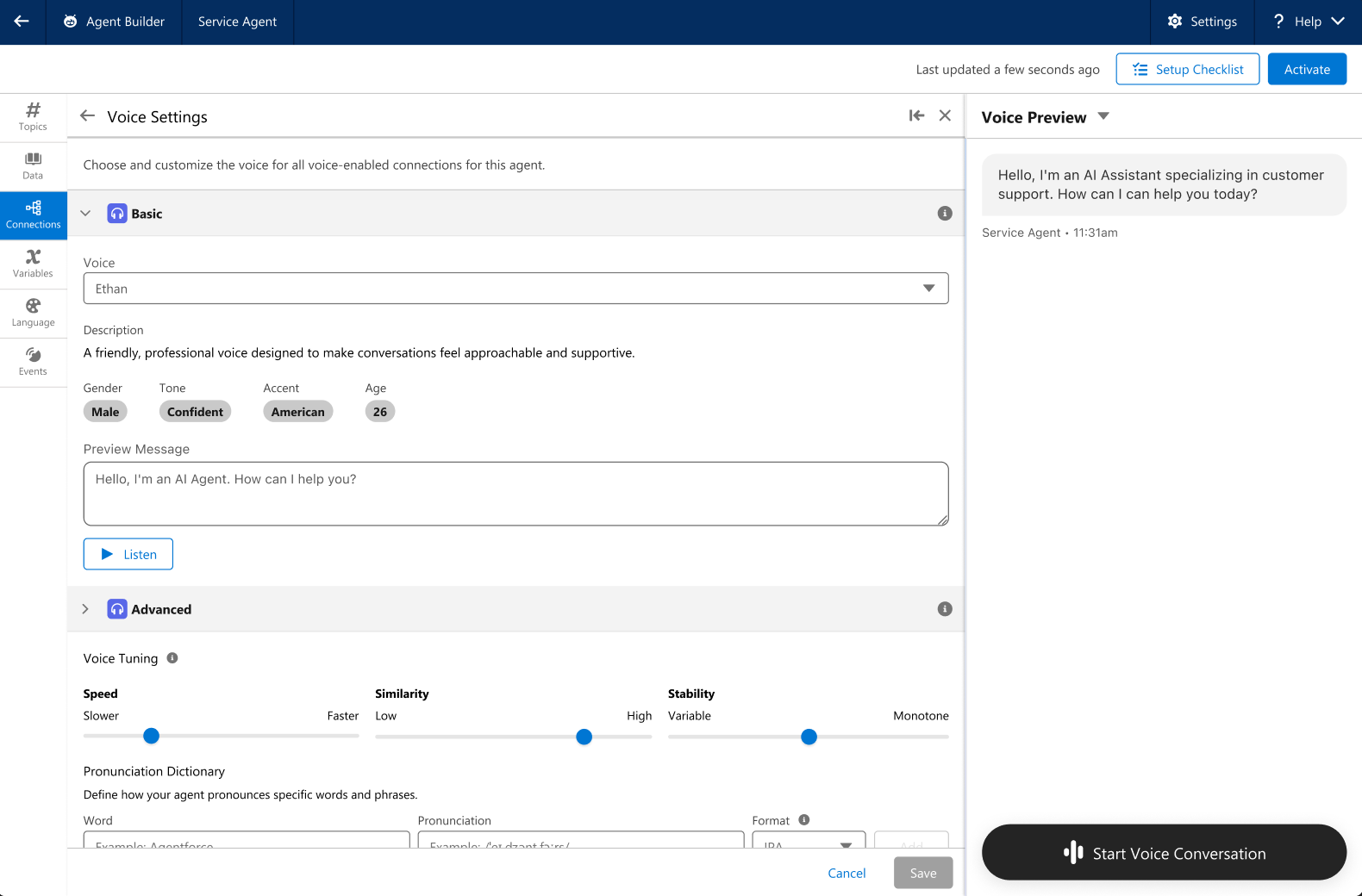 Best of all? Agentforce Voice can reuse all your existing text-based agent configurations, including action and context variables, eliminating the need to build from scratch. You can enable voice for any existing agent and make tweaks in the same builder experience you’re already familiar with. Once voice mode is enabled, you can customize settings like the agent’s gender, tone and accent, as well as advanced controls that define how fast your agent speaks, their emotional range and how consistently they stick to the underlying voice model and original audio used to train that specific voice selection.