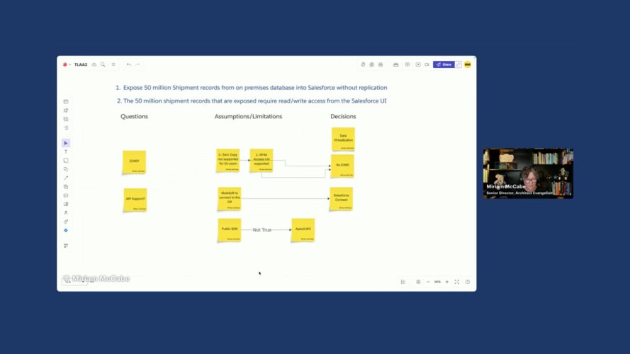 In this interactive episode, experts apply the What/How/Why approach to design a solution that exposes millions of on-premise records in Salesforce without replicating data and consider the best approach to send updates to an external system.