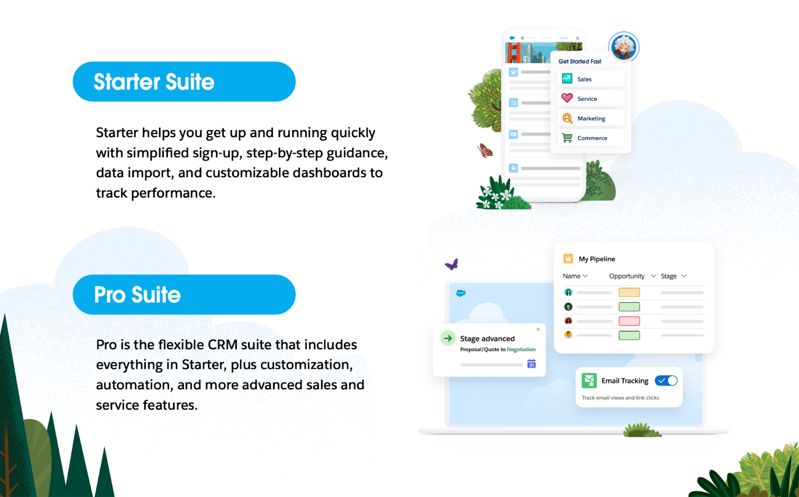 Start your journey with a free trial of Starter Suite today. Looking for more customization? Explore Pro Suite. Already a Salesforce customer? Activate Foundations and try out Agentforce 360 today.