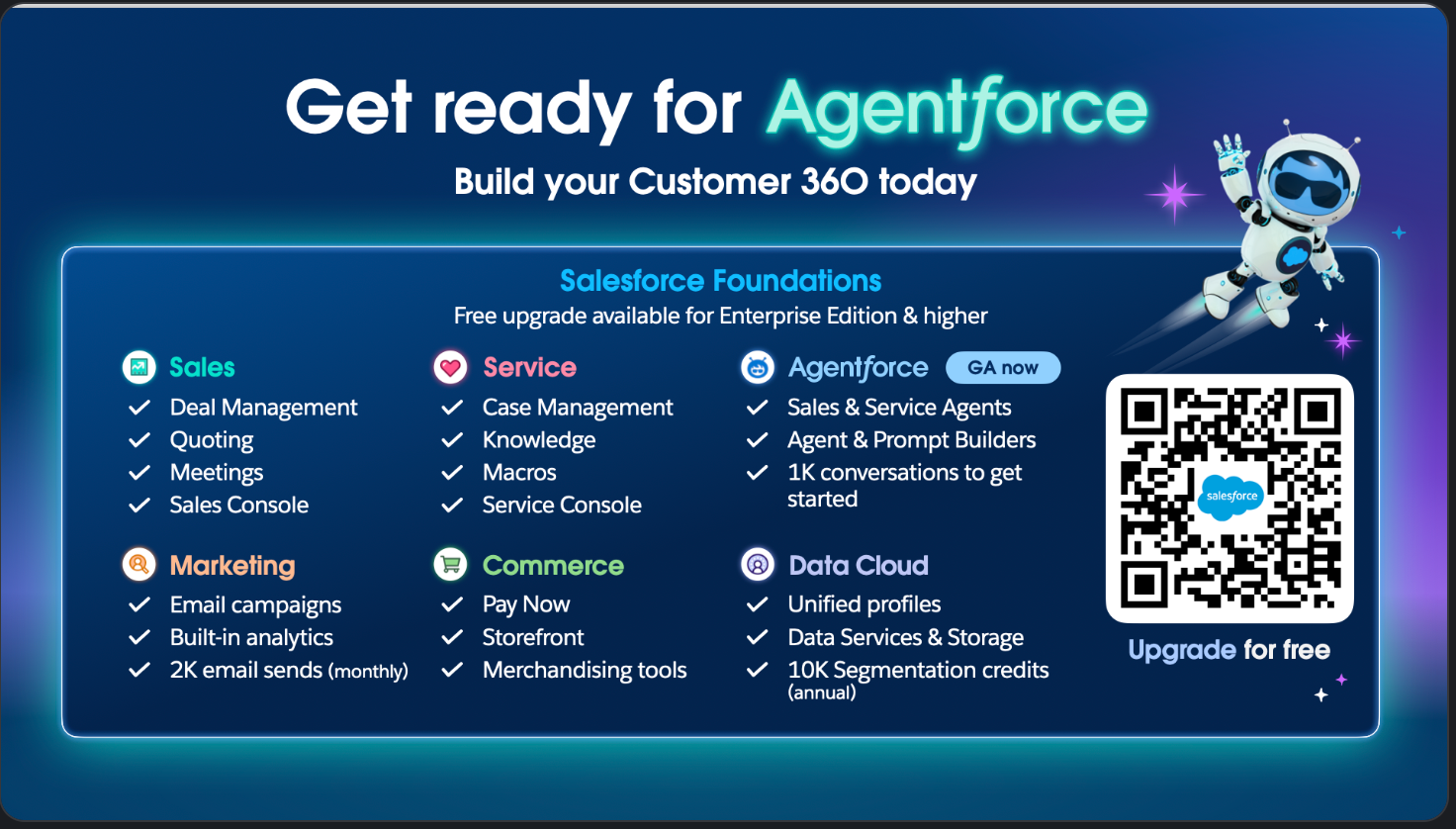 Salesforce Foundations is a free CRM upgrade for Salesforce customers on Enterprise Edition or higher. It provides access to key features across Sales, Service, Marketing, Commerce, and Data Clouds, serving as a way for existing Salesforce customers to get a taste of new functionalities, including autonomous AI agents like Agentforce 360.
