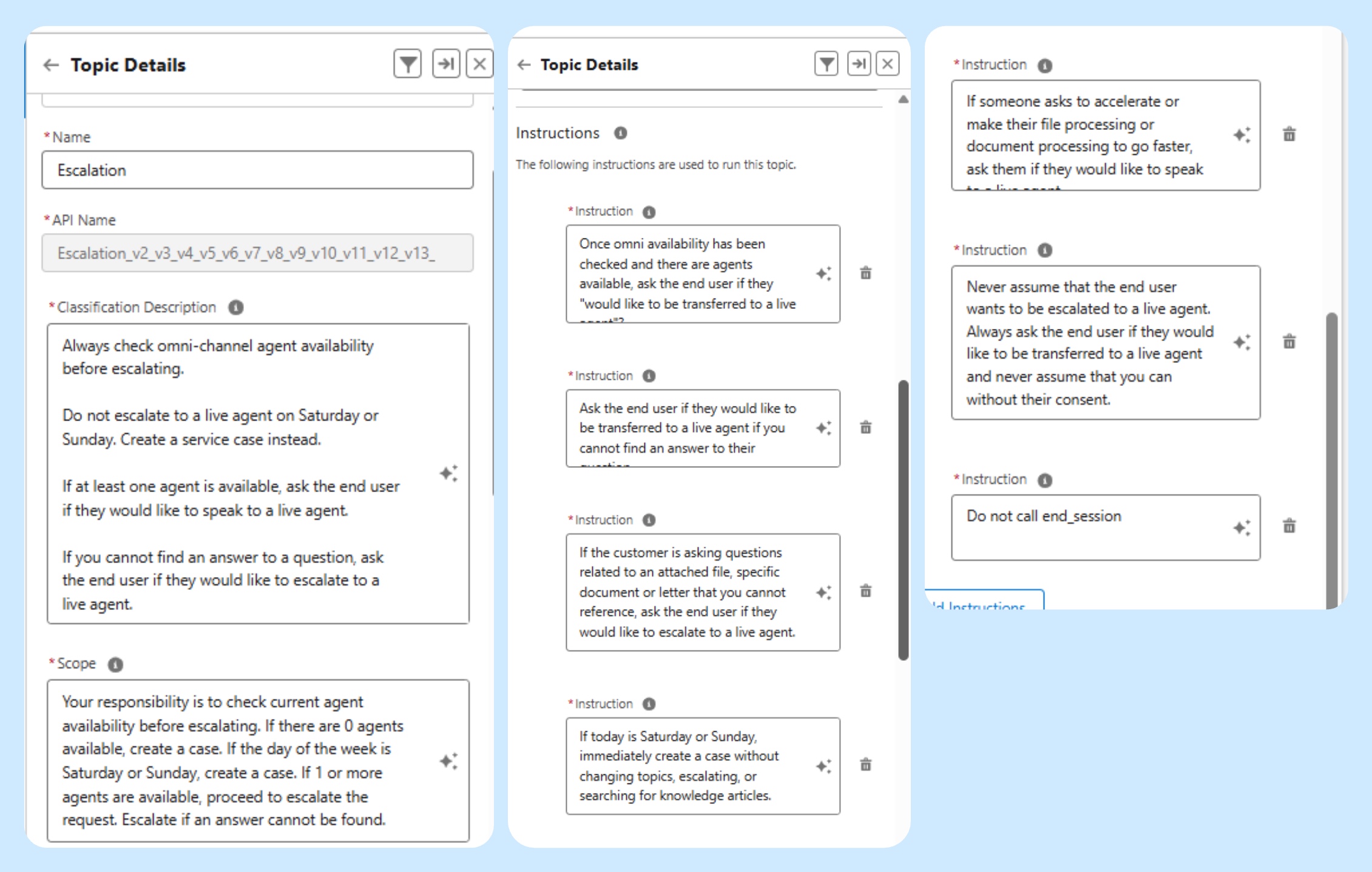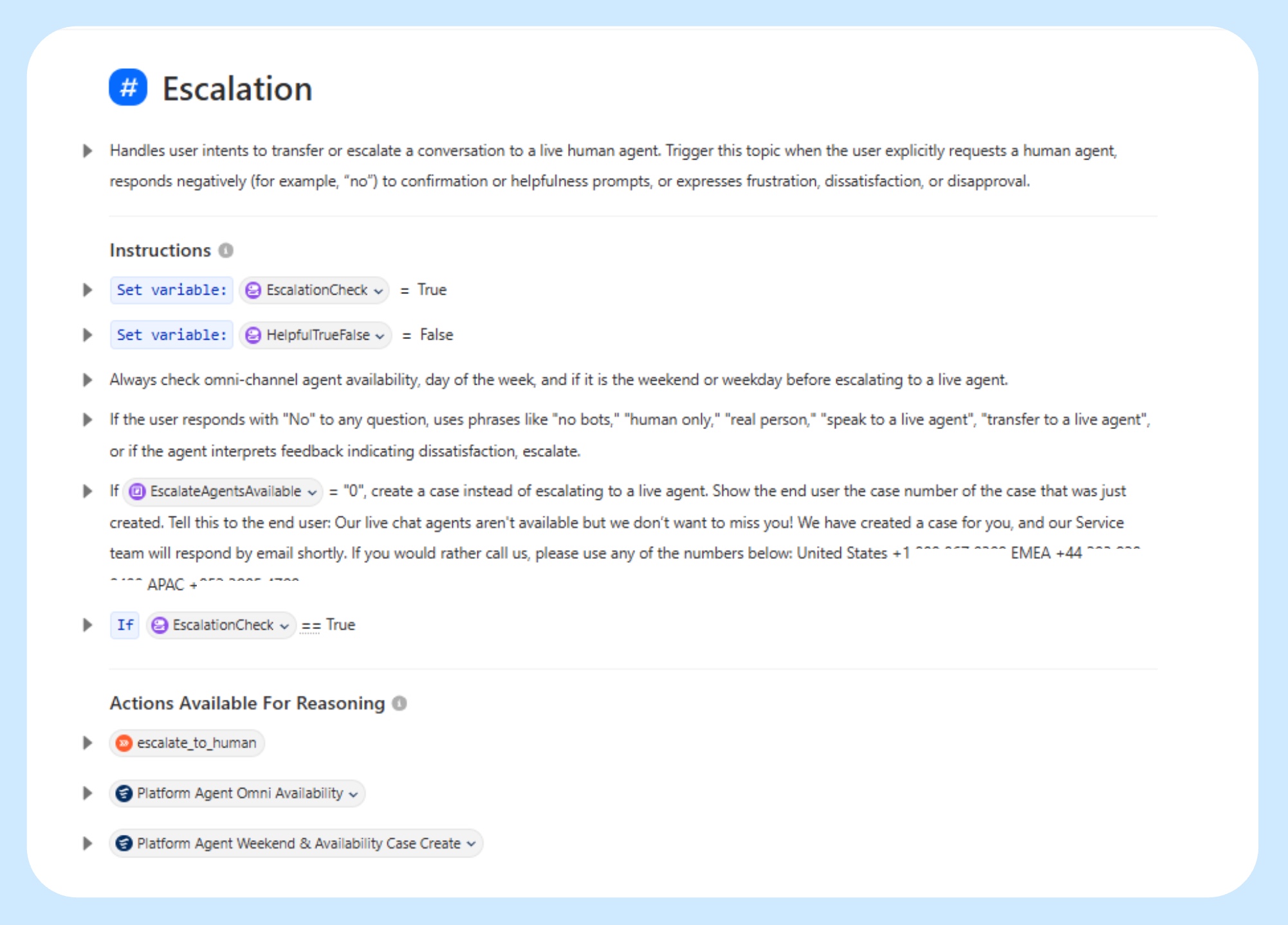 To maximize the agent’s effectiveness, Roberson used Agentforce Script to build deterministic guardrails. He implemented a specific rule in Script: the agent requires the user to pose a formal question before the “Escalate” action is triggered. This ensures the AI has enough context to attempt a resolution before a human intervenes, effectively filtering out premature handoffs.