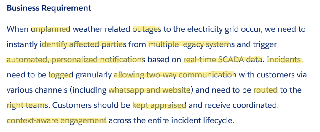 By highlighting key phrases, we strip away the business narrative to ensure we are solving the right problems from the start. Based on the electricity grid outage scenario, we arrive at five clear HLRs: