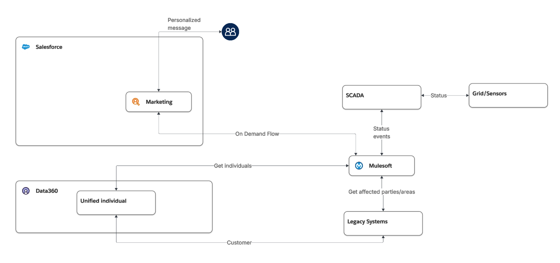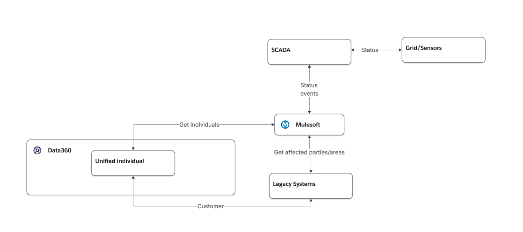 To connect the grid areas impacted to the individuals affected, we assume that the legacy systems have the knowledge of that relationship and that leads to the decision to use MuleSoft to: