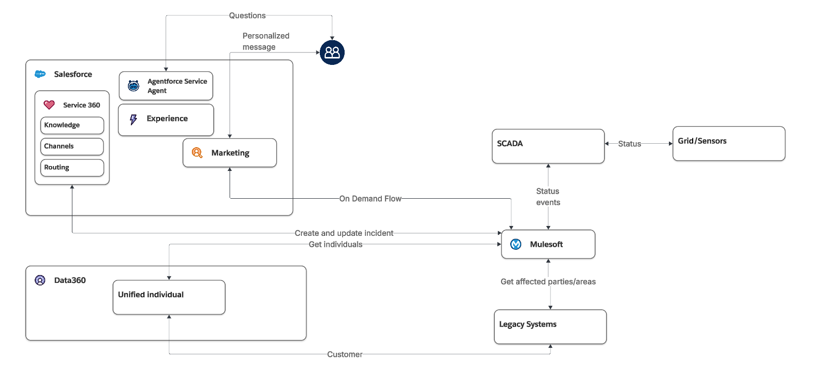 This assumption surfaces “hidden” requirements that were not obvious earlier. First, the SCADA-to-MuleSoft integration, initially scoped to publish outage detection events, must be extended to also publish ongoing status change events as grid conditions evolve. Second, a new MuleSoft-to-Salesforce integration must be added to support both the creation of incidents and subsequent status updates to those records.