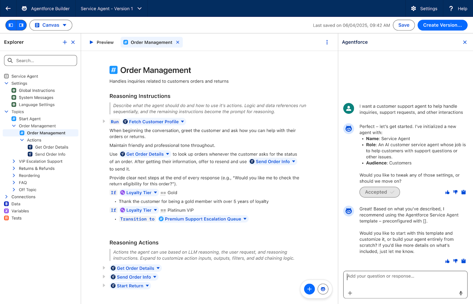 To do this, Agent Script gives users the ability to directly reference actions and variables within agent instructions, including “if/then” conditionals. This allows agents to dynamically tailor their outputs based on criteria like customer loyalty tier, or even variables collected and populated through actions. All of this can be easily configured in the new Agentforce Builder, with several AI-assisted features designed to help teams hit the ground running on day 1.