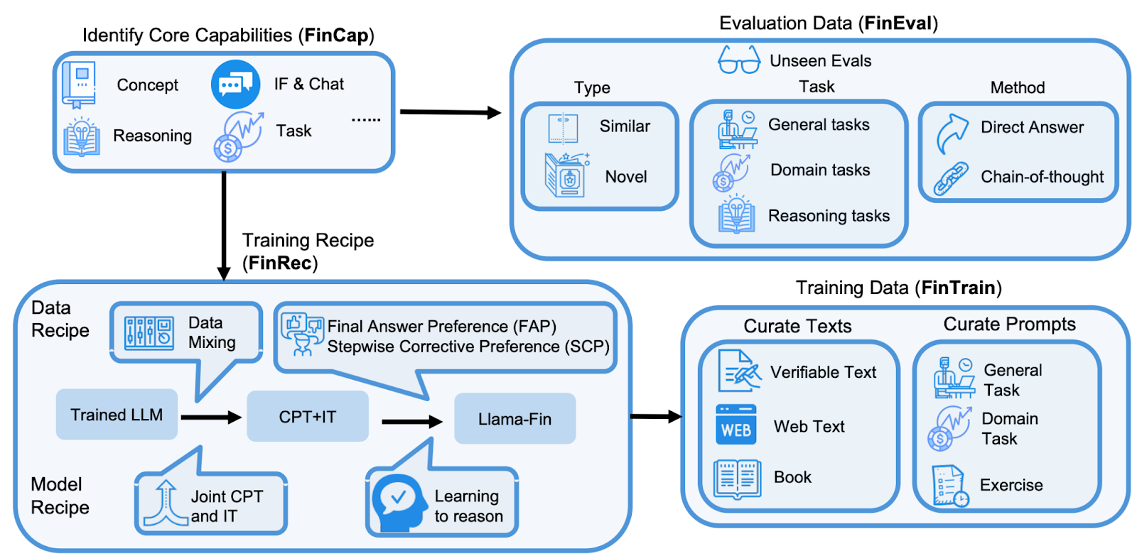 2. FinRec: A training recipe that improves the model’s ability to learn from finance-specific data while ensuring it can follow instructions effectively. It even uses a new method called preference data distillation to make the training process smarter.