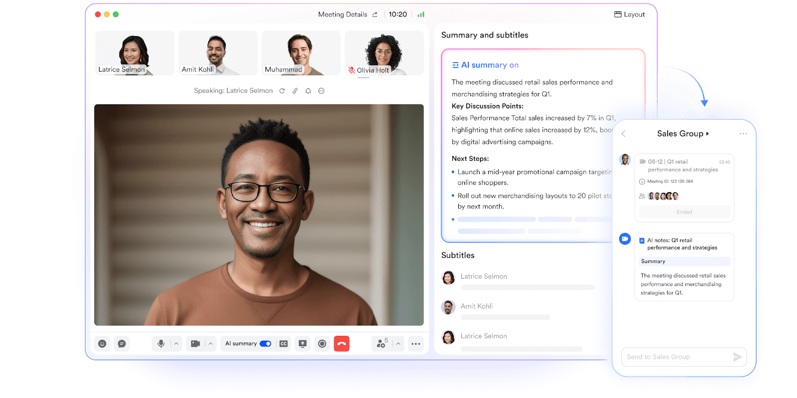 - AI features: Real-time transcription, meeting summaries, and noise cancellation powered by AI.