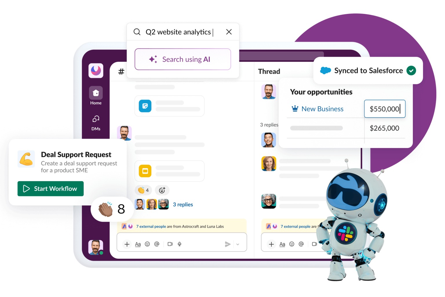 - AI features: With Slack AI (activated via Foundations), you can summarize long conversations, create meeting notes, and highlight important information to help team members catch up quickly.