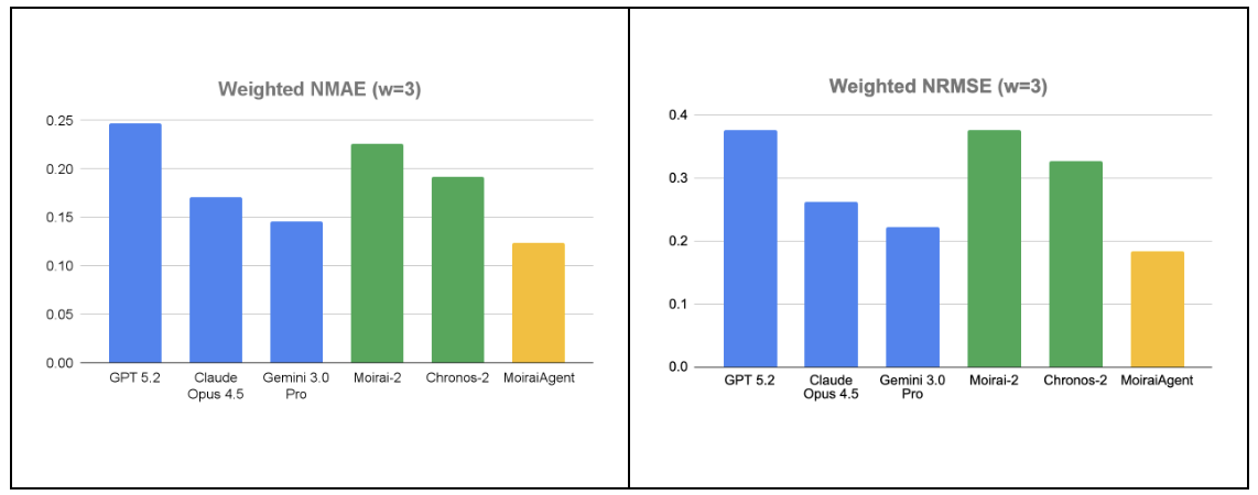 We evaluated MoiraiAgent on GIFT-CTX against leading competitors, including both specialized foundation forecasting models and frontier generalist LLMs. As shown in Figure 7, MoiraiAgent achieves the best overall performance, outperforming all baselines. With a weighted NMAE of 0.124 and weighted NRMSE of 0.184, MoiraiAgent substantially surpasses time-series foundation models like Moirai2 (0.226/0.377) and Chronos2 (0.192/0.327), as well as generalist baselines like GPT-5.2 (0.247/0.376), Claude Opus 4.5 (0.171/0.262), and Gemini 3.0 Pro (0.146/0.223). Note that all methods used medium reasoning effort.