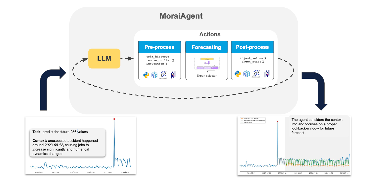 At its core, MoiraiAgent leverages powerful large language models (LLMs) and sophisticated data-analystics tools to understand, integrate, and reason over heterogeneous data. This makes it particularly valuable for scenario-planning use cases, where context and change matter as much as historical trends. By moving beyond conventional forecasting boundaries, MoiraiAgent delivers predictions that are not only data-driven, but also context-aware and responsive to real-world conditions.