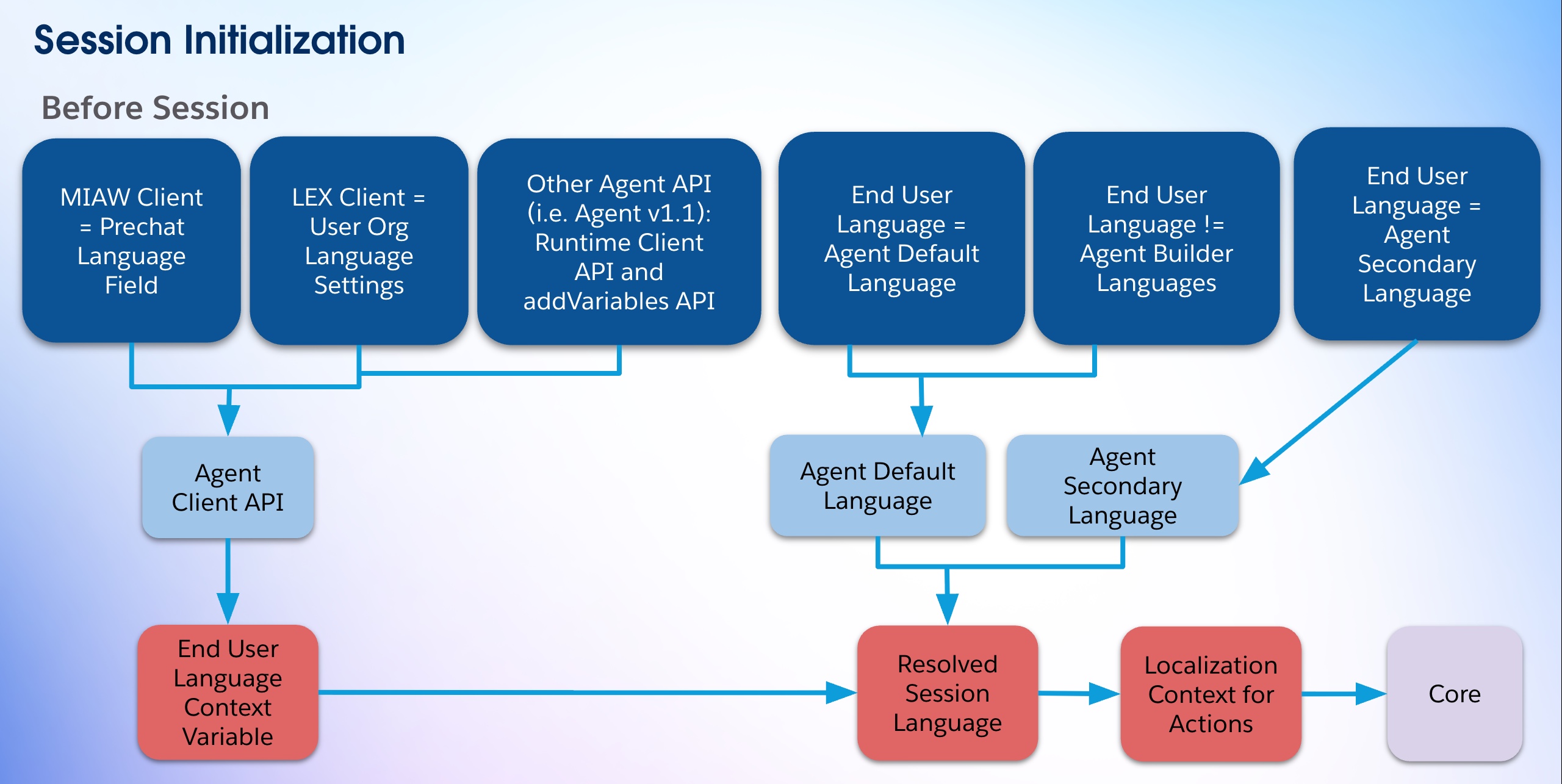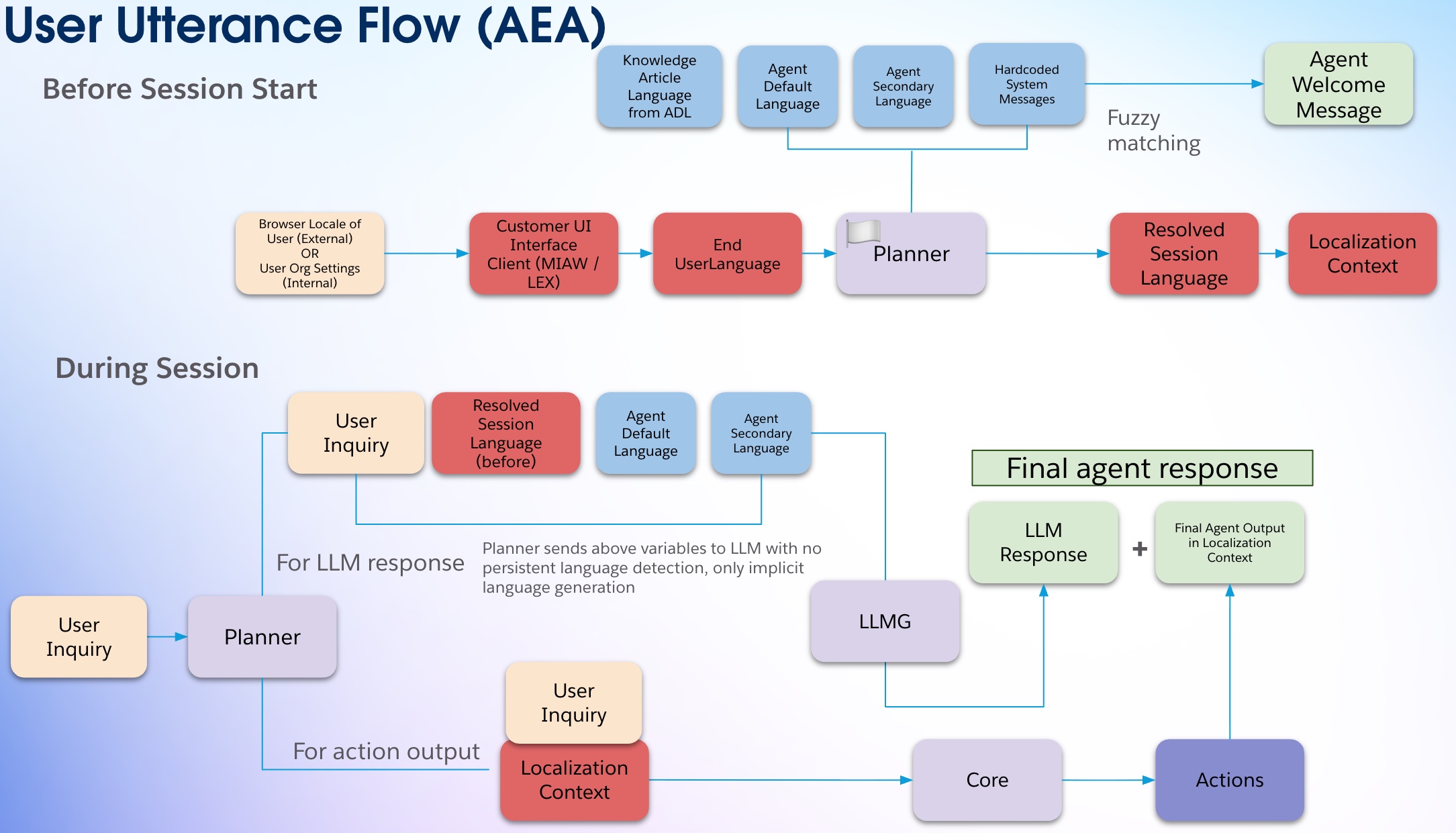 Since many of our customers operate in non-English-speaking countries, multilingual support is a core priority at Salesforce. In this guide, we’ll explore the components and configuration settings underpinning multilingual support in Agentforce and provide valuable tips and tricks for dialing in correct responses. This document details Agentforce’s multilingual architecture, outlining how language support is integrated, from session start, to processing user utterances, to action execution. Let’s dive in.